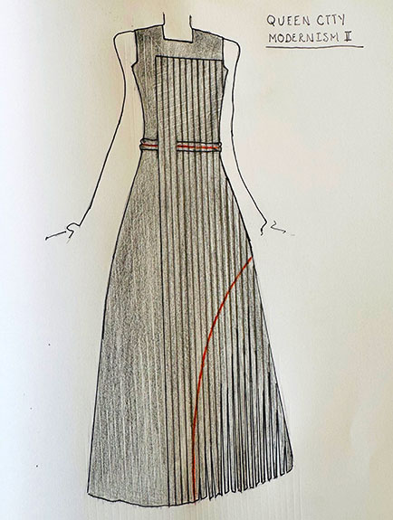 | Left: "LFNG V" 2025, acrylic on canvas mounted to plywood,stainless steel and cotton thread, 14” X 14” Right: Sketch for "Queen City" line drawing dress. Queen City housed roughly 900 people in 1940 with its own businesses, churches, and fire station. It was home to about 200-300 households, with roots dating back to 1892. |